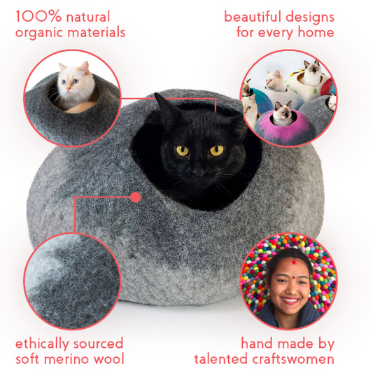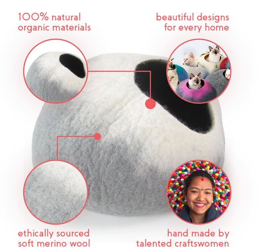 Each Cat Cave is hand-felted with love from the highest quality, soft merino wool to ensure that your pet is happy and healthy. They are handmade with 100% organic materials - no chemicals, no emissions, no factories… just love.