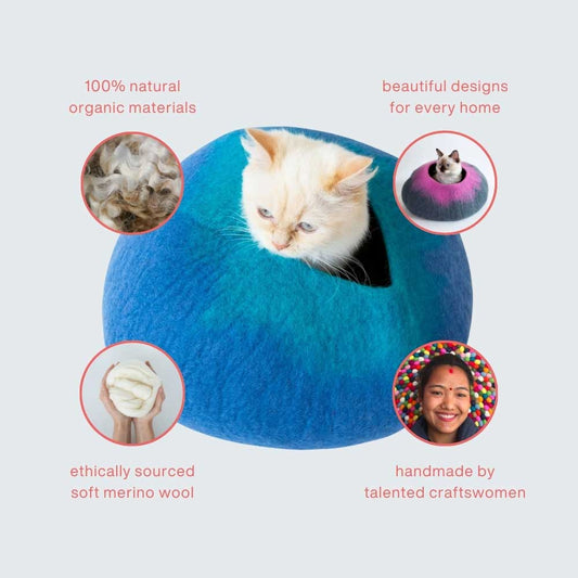 Each Cat Cave is handmade so measurements may vary slightly. The wool is 100% naturally dyed and left to dry outside, therefore there may be slight variations to color and size as a result. The brightness on your device will also affect the color.